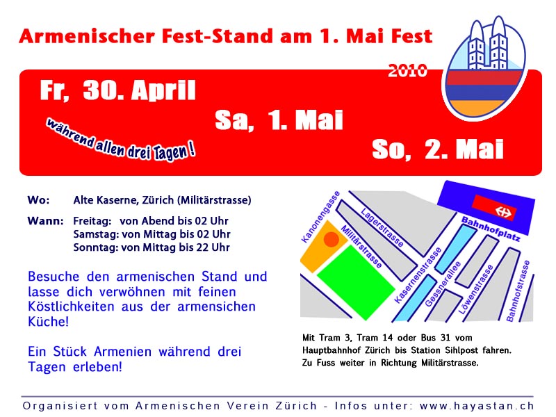 Armenischer Stand am 1. Mai Fest in Zürich! Der Armenische Verein Zürich ist zum 3. Mal dabei. Besuche uns am Fest und helfe mit bei der Organisation.