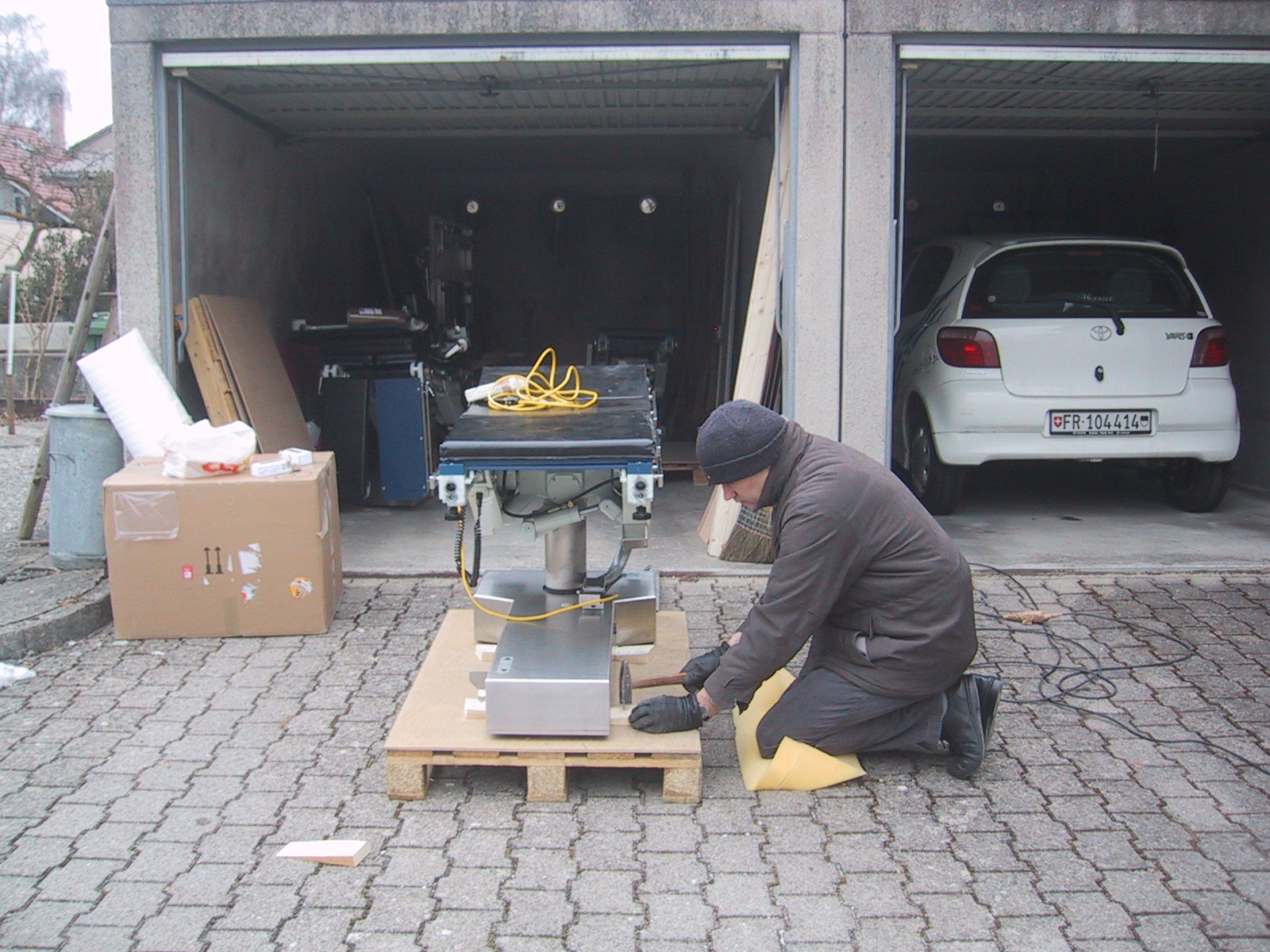 Nach den langen administrativen Schreibereinen, sind die Tische freigegeben und nach Bulle transportiert, wo sie für den weiteren Transport von M. Riedo eingepackt werden sollen. |