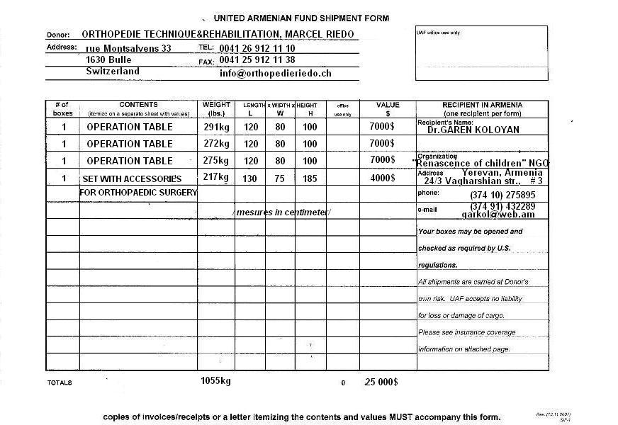 Den Transport von Köln nach Yerevan übernimmt die amerikanische Organisation UAF (United Armenian Found); die Vertreterin Nouritza Abujamra arbeitet seit langem mit Spital Arabkir und Dr. Koloyan. Die nötigen Papiere für die Operationstische werden mit ihr vorbereitet. |