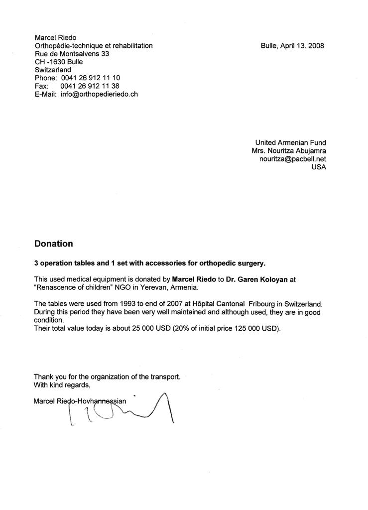 Dr.Karen Goloyan, Chirurg, Kinderorthopedie, Spital Arabkir, bekommt drei orthopädische Operationstishe mit Zubehör, in gutem Zustand, vom Kantonspital Fribourg gespendet. Die Vermittlung mit dem Dr. Thorin geht über Marcel Riedo, Orthopädietechniker, 1989-1991 in Armenien tätig. |