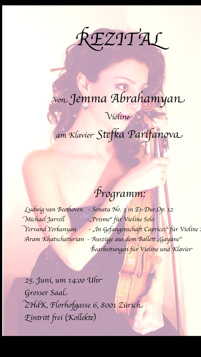 Rezital Master Konzert mit Jemma Abrahamyan (Violine) Antonio Vivaldi, Arno Babajanyan, Michael Jarrell, Béla Bartok Beginn 20:30 Uhr