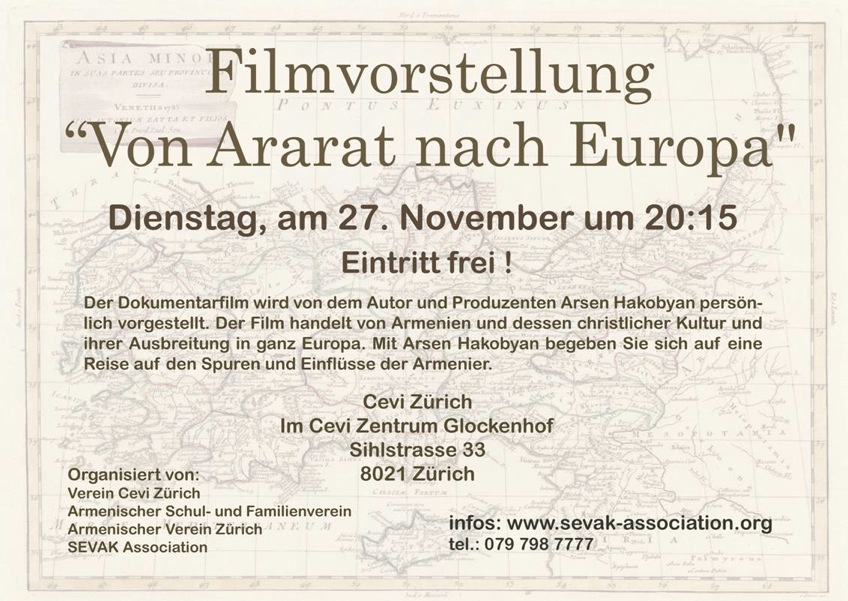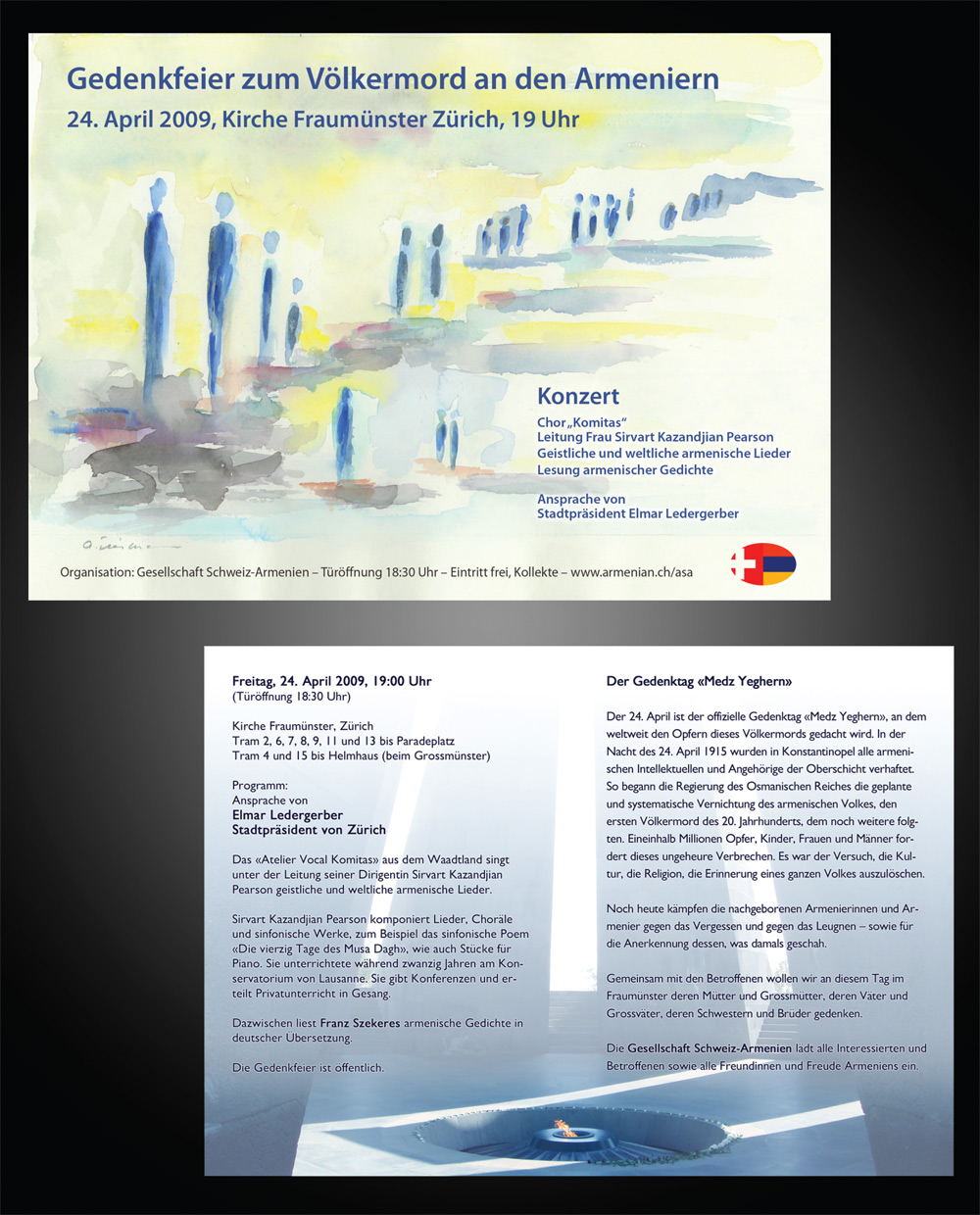 Am Samstag, 21. April 2007, um 14.00 Uhr lädt der Cevi Zürich herzlich ein zu einem nachmittäglichen armenischen Chorkonzert im Gedenken an den Genozid am armenischen Volk. Der Chor «ARAX» unter der Leitung von Diana Sagherian-Boyaciyan aus Genf singt zum Gedenken an den Genozid armenische Trauer- aber auch Volkslieder. Begleitet wird das Programm von Gedichten und instrumentellen Klängen.