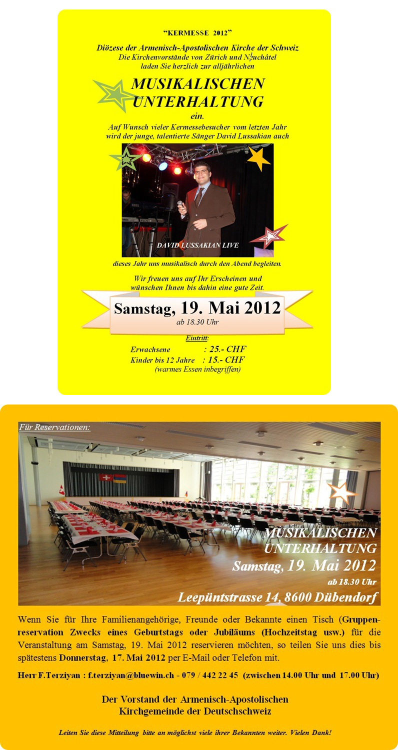Dauer: 15°° - 19°° Uhr. Vielseitiges Programm mit Willkommensbotschaften von Politikern, musikalische Unterhaltung und Referat über den Völkmord an den Armeniern. Wir danken all denjenigen, die mit ihrer grosszügien Unterstützung den Anlass zum Erfolg verhelfen und einen Beitrag für die Gerechtigkeit im Namen der Armenier in der Schweiz und welt weit leisten.