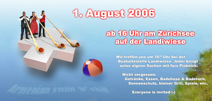 Es ist so weit! Am 18. März 2006 findet in Zürich ein grosses armenisches Fest statt, mit feierlichem Abendessen, verschiedenen Aufführungen und festlicher Stimmung!