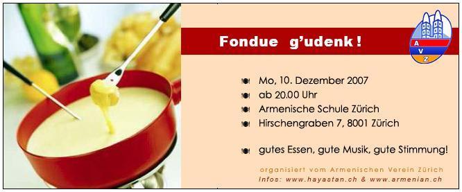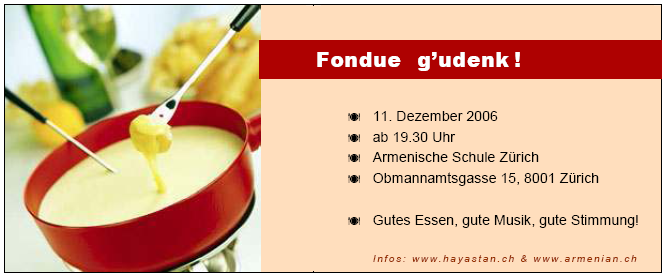 Wer die Armenische Schule Zürich kennenlernen möchte, ist am Montag, 11. Dezember 2006 herzlich zum Fondue-Essen im gemütlichen Rahmen eingeladen. Zeit: ab 19.30 Uhr. Aufgrund der Vorbereitungen (Essen/Getränke/Plätze) bitte Anmeldung senden an: andy@armenian.ch
